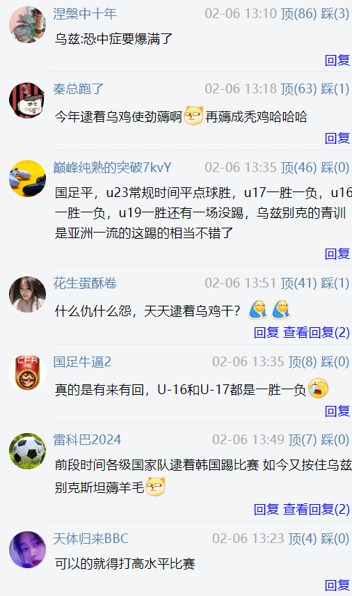 ——国足平,u23常规时间平点球胜,u17一胜一负,u16一胜一负,u19一胜还有一场没踢,乌兹别克的青训是亚洲一流的这踢的相当不错了